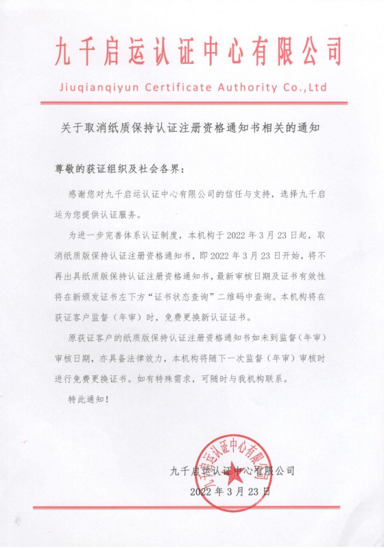 关于取消纸质保持认证注册资格通知书相关的通知